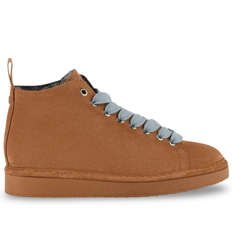 Polacchini Panchic donna con tomaia in camoscio di colore marrone, fodera interna in eco pelo e lacci azzurri a trama larga.