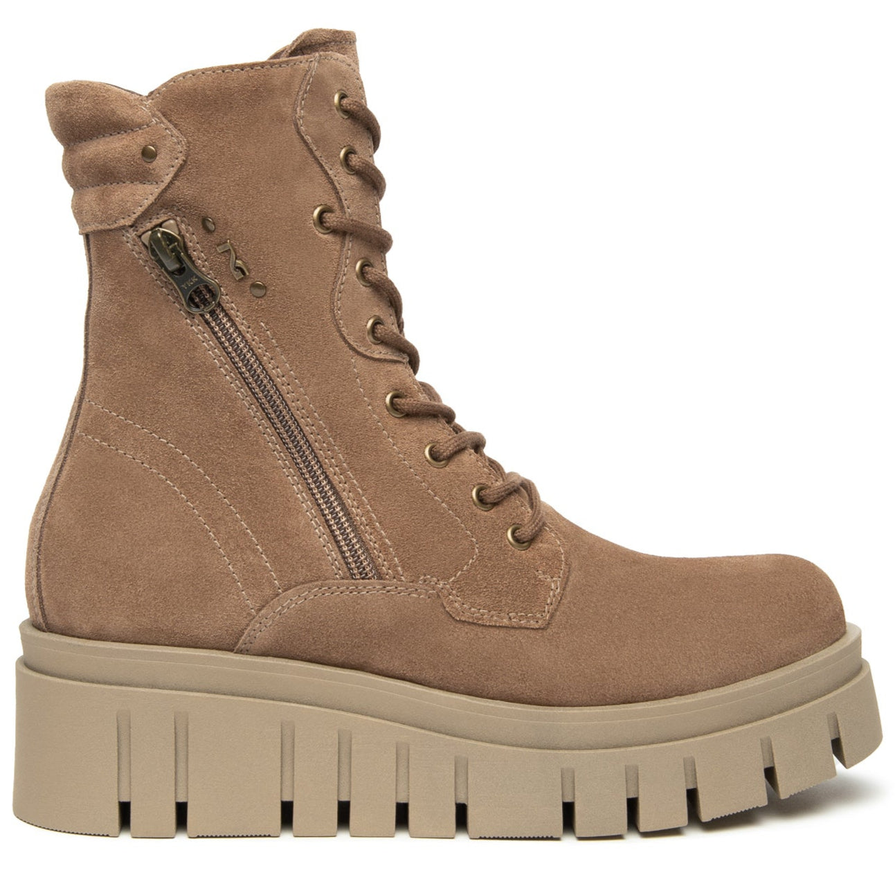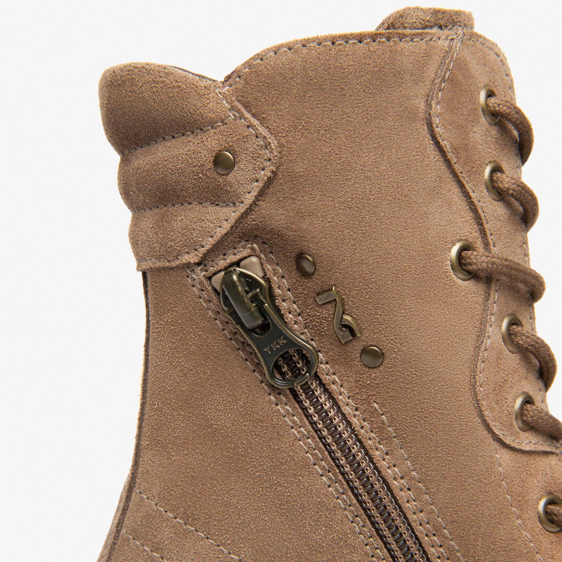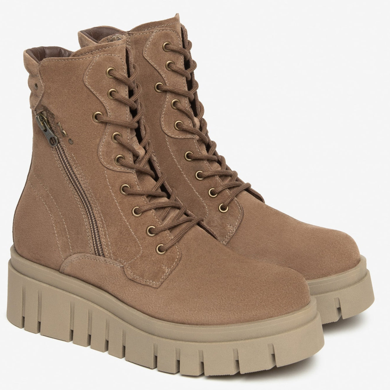 Anfibi NeroGiardini donna in pelle scamosciata colore caramello con suola in gomma di 5,5cm. Presenza di lacci e zip interna per agevolare la calzata giornaliera.