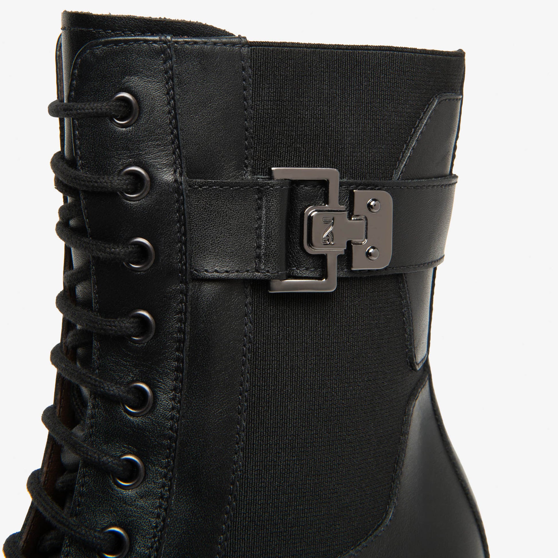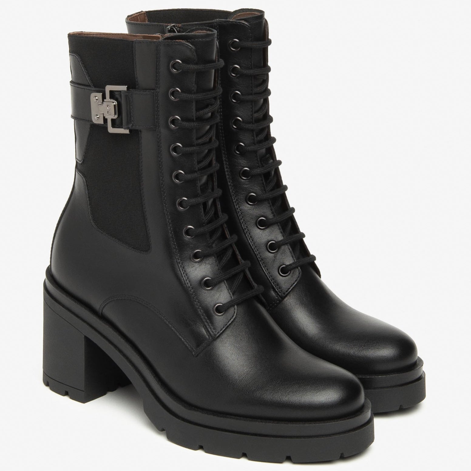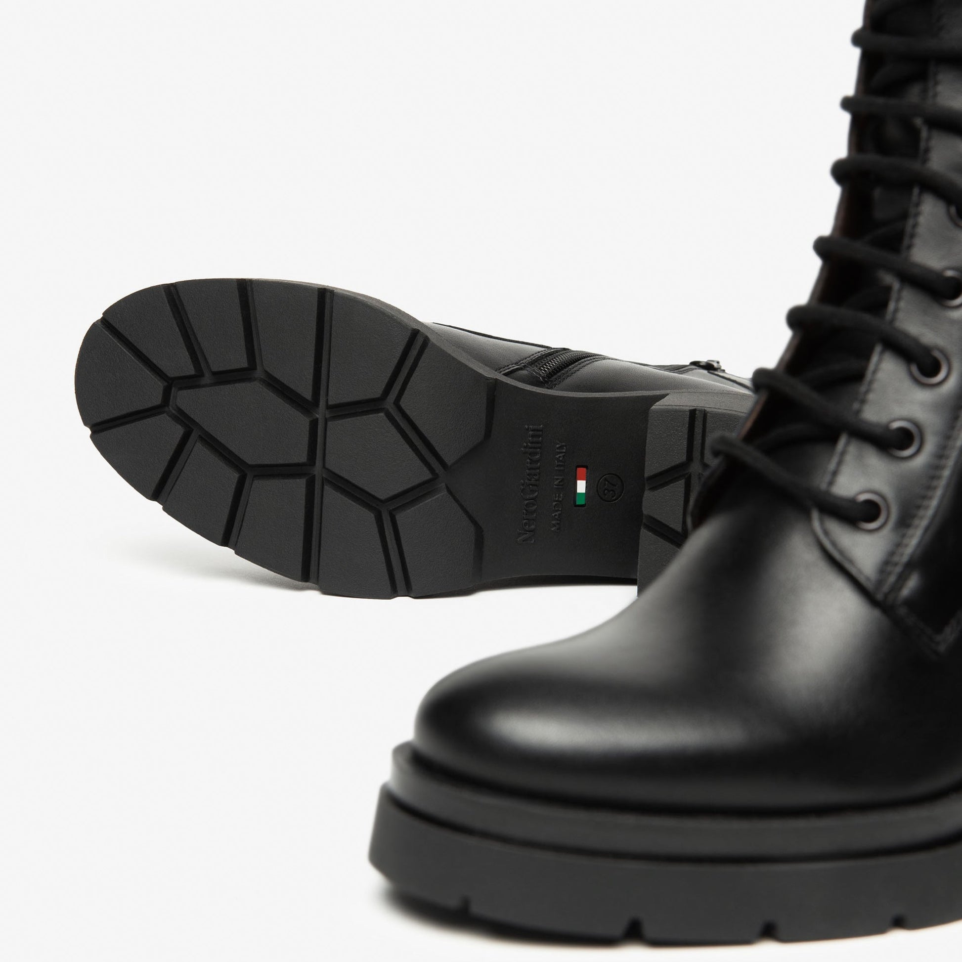 Anfibi NeroGiardini donna in pelle colore nero con tacco e lacci. Presenza di zip laterale interna per agevolare la calzata giornaliera e tacco a blocco di 8 cm.
