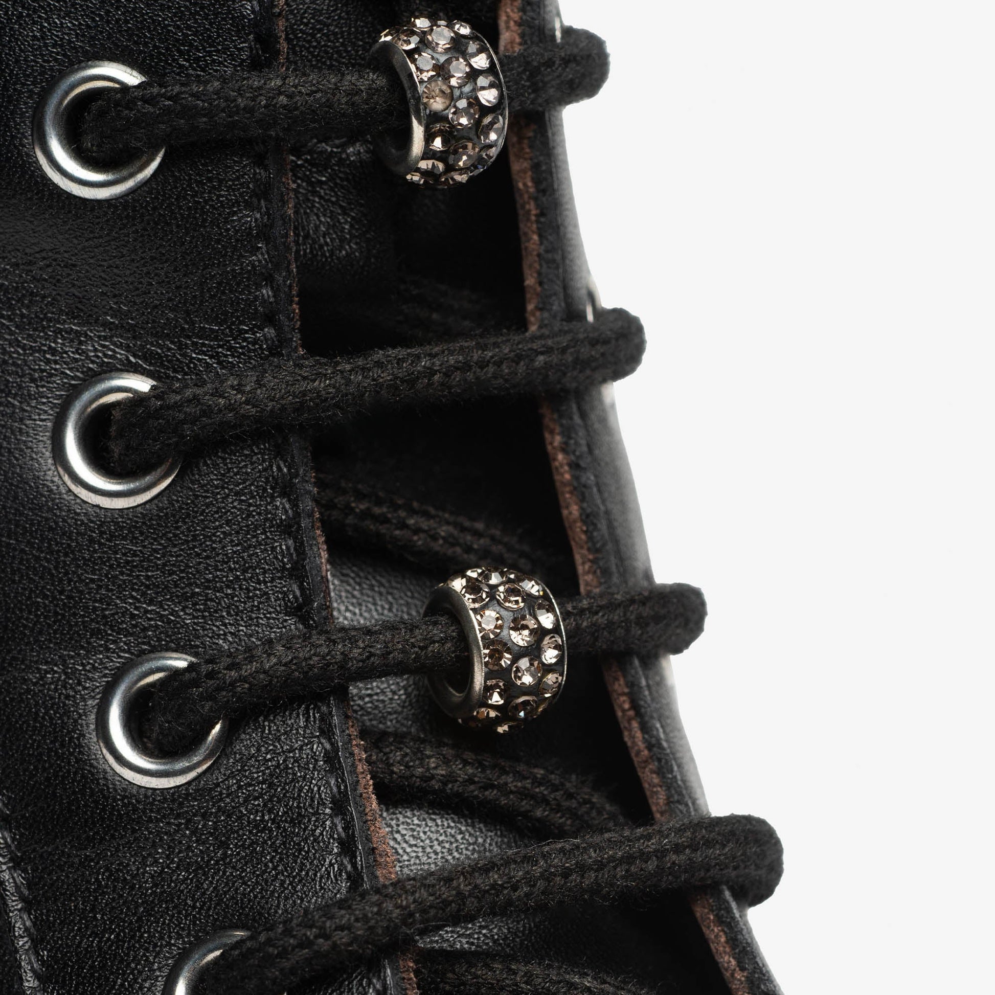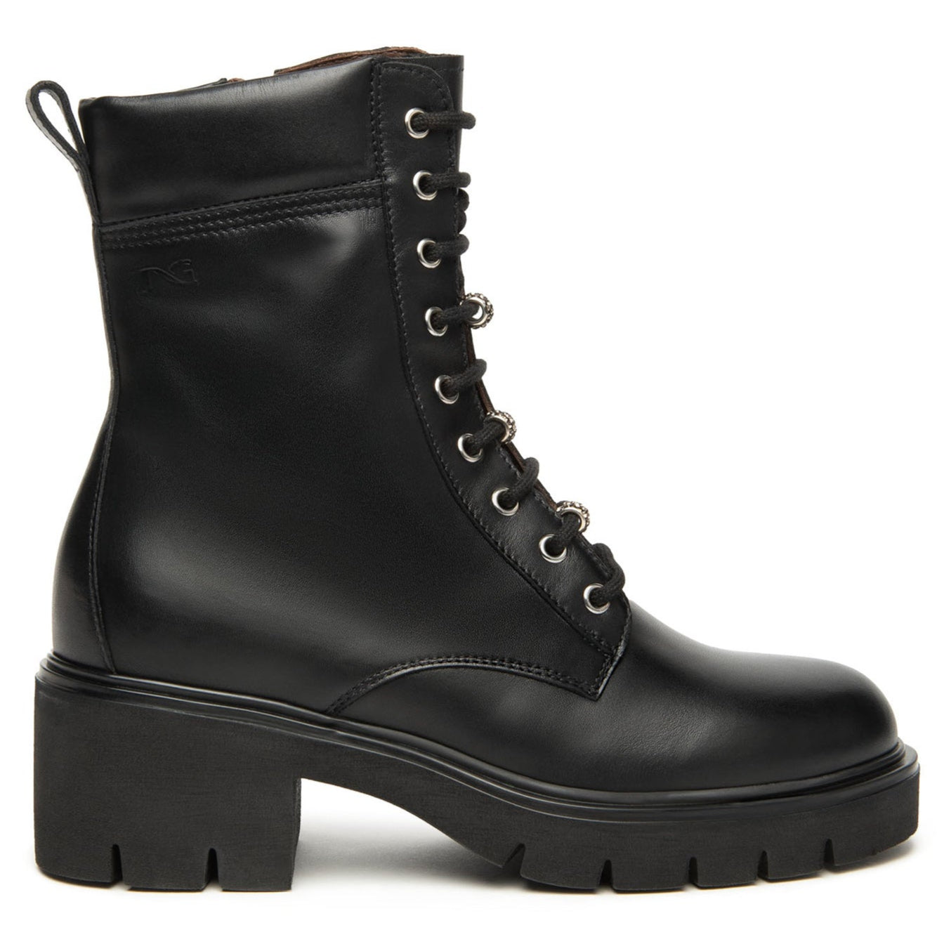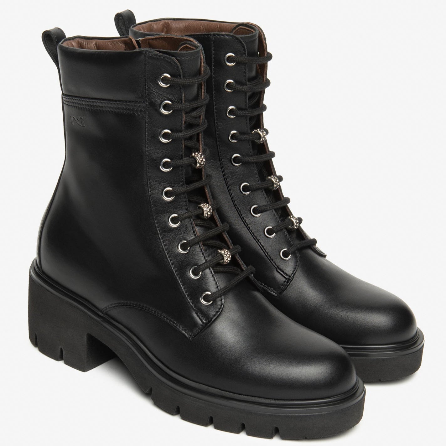 Anfibi NeroGiardini donna in pelle colore nero con tacco, lacci e inserti luminosi colore argento. Presenza di zip laterale interna per agevolare la calzata giornaliera e tacco a blocco di 6 cm.
