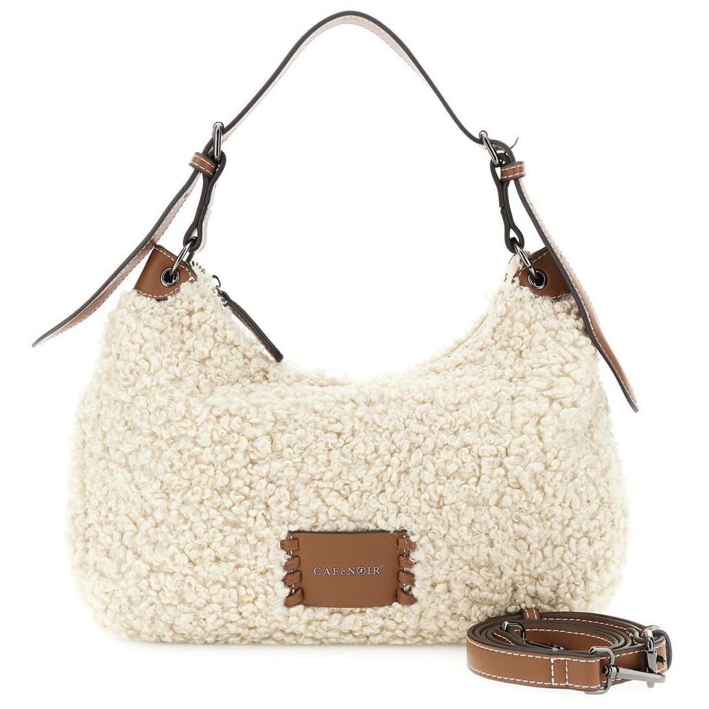 Borsa morbida modello a spalla CafèNoir in tessuto ricciolino effetto pelliccia colore naturale. Presenza di tracolla lunga e chiusura con zip.