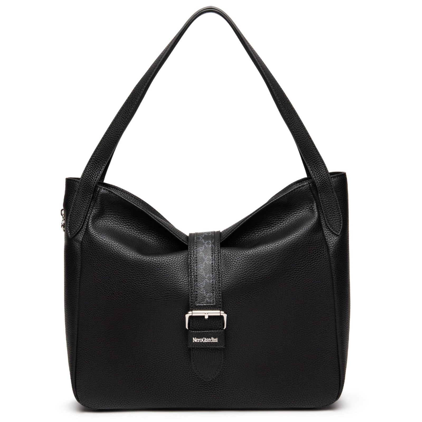 Borsa grande modello hobo NeroGiardini nella colorazione nero con inserto trama.