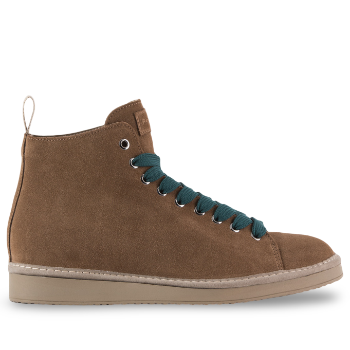 Polacchini Panchic uomo con tomaia in camoscio di colore caramello, fodera interna in finto pelo e lacci neri a trama larga.