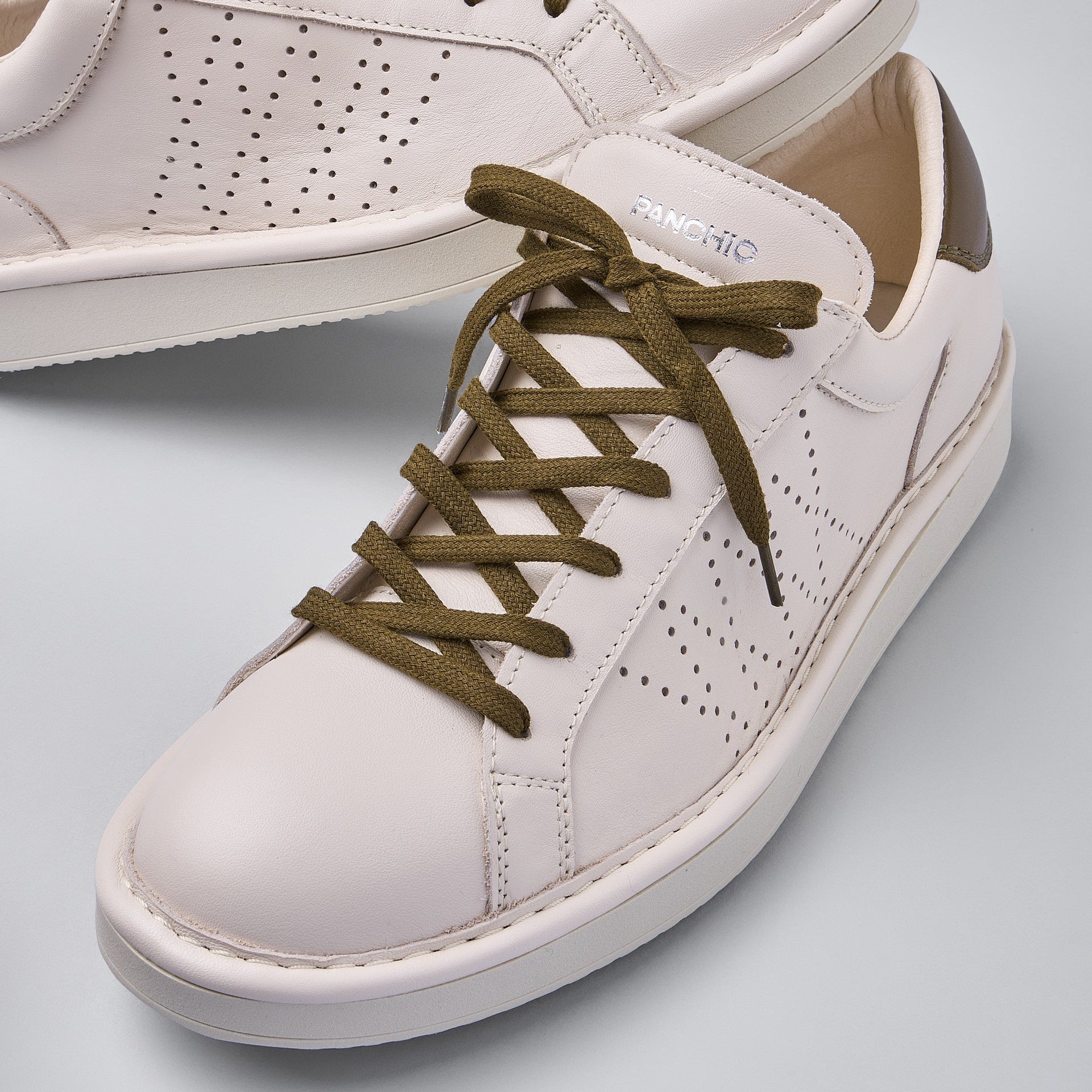Sneakers Panchic uomo con tomaia in nappa avorio e spoiler verde militare. Lacci piatti di cotone neri e fodera di cotone.