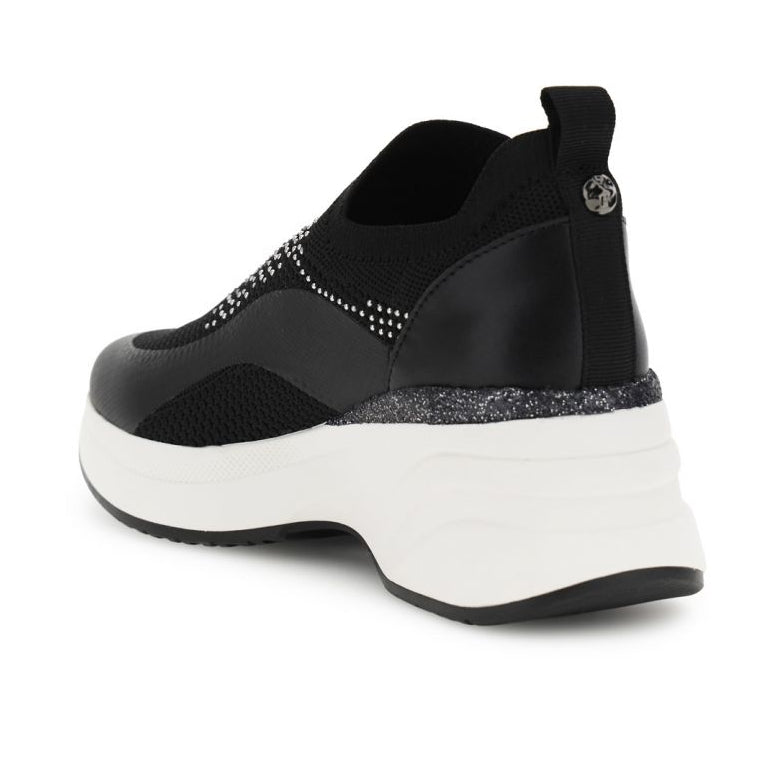 Sneakers CafèNoir donna modello running slip-on in tessuto tecnico elasticizzato con borchie e strass, dettagli con glitter. Fodera in tessuto soletto in pelle suola platform 5,5 cm. Una scelta pratica e funzionale per chi cerca comfort senza rinunciare allo stile.